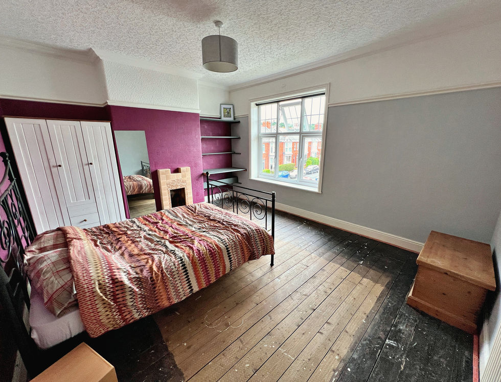 The large Master bedroom, with bay windows letting in plenty of light, also boasts an original fireplace.